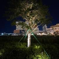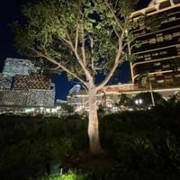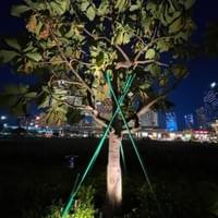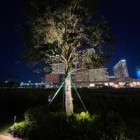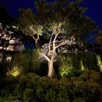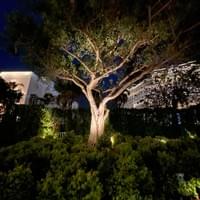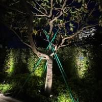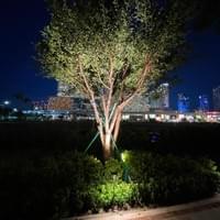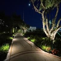 .Description: Two types of LED spike-mount spotlights were used along this walkway. The first type is used to highlight individual trunksand trees acting as dividers. These feature a tailor-made green housing to
